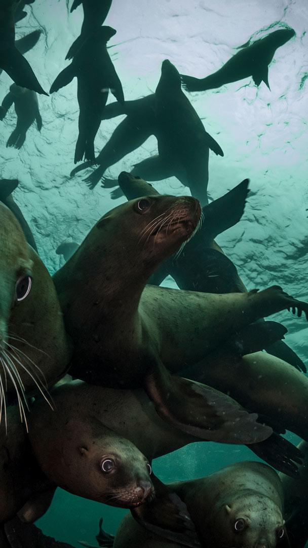 Steller sea lions might look like laid-back loungers on rocky shores, but they are noisy and nosy. Built with broad chests and thick necks, they are hard to miss. Today"s image features Steller sea lions gliding through the chilly waters off the coast of Vancouver Island in Canada. These marine mammals are heavy—females average more than 260 kilograms, while males are around 540 kilograms. Males are noticeably larger than females and are known for their loud roars and flatter snouts. Their deep vocalisations include belching, growling and snorting to warn others and communicate underwater. Males get loud to defend turf, while moms and pups use unique calls to find each other in a crowded rookery. Despite their size, they"re preyed on by orcas and large sharks. These sea lions are considered near-threatened. Ocean conservation keeps them—and countless other mammals—afloat.