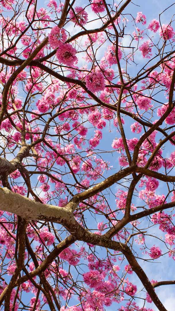 Sombra fresca e cores vivas Vista de baixo ângulo de uma árvore com flores cor-de-rosa contra o céu, Distrito Federal (© Bruno Couto via 500px/GettyImages)