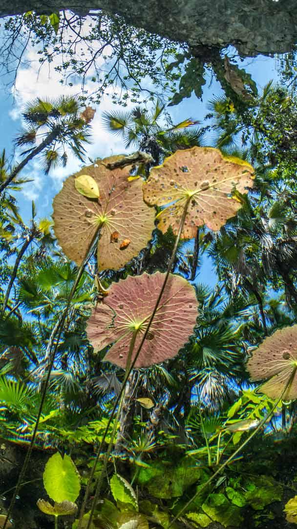 Correntes de vida Vitórias-régias na superfície do Cenote Nicte-Ha, Tulum, México (© Franco Banfi/NPL/Minden Pictures)