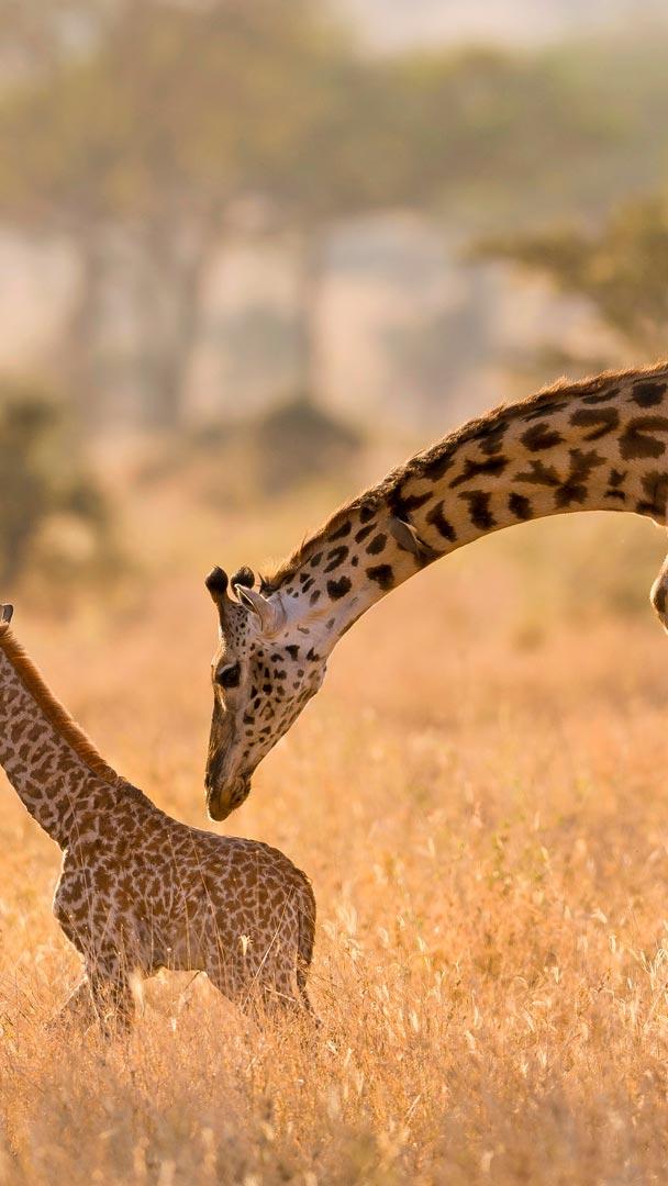 Elegância em extinção Girafa-masai cuidando seu filhote no Serengeti, Tanzânia (© Alberto Cassani/Getty Images)