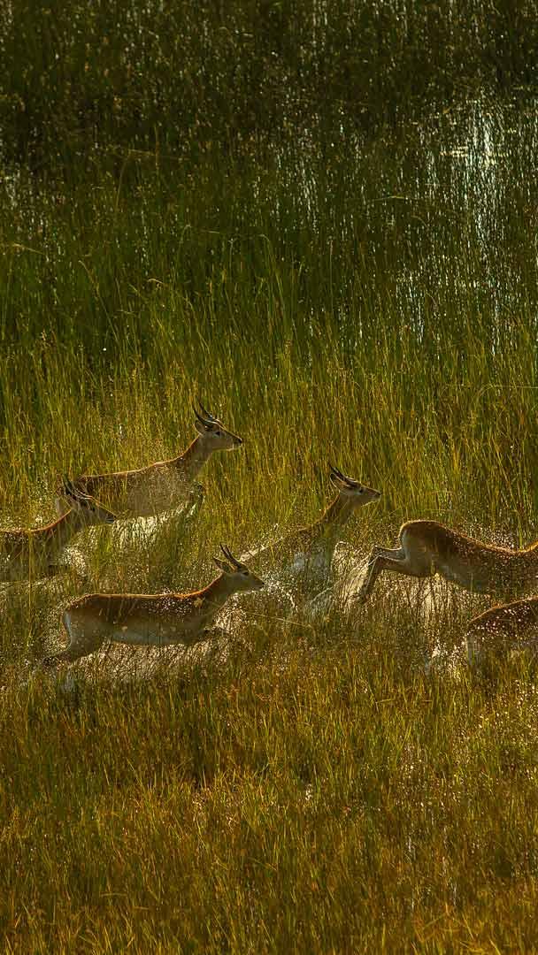 With their elegant leaps and graceful movements, lechwe are the epitome of agility and poise on the African savanna. These antelopes, known for their distinctive reddish-brown coats and lyre-shaped horns, are native to the wetlands and floodplains of south-central Africa, including the Okavango Delta in Botswana, which is a UNESCO World Heritage Site. Lechwe are social animals, often found in herds of thousands. In the heart of the delta, they are an integral part of the region"s rich biodiversity, coexisting with other species like elephants, lions, rhinos and hippos, wading through the water. Their presence adds to the delta"s natural allure, which draws in thousands of safari enthusiasts and is proof of wildlife"s resilience in the face of environmental challenges.