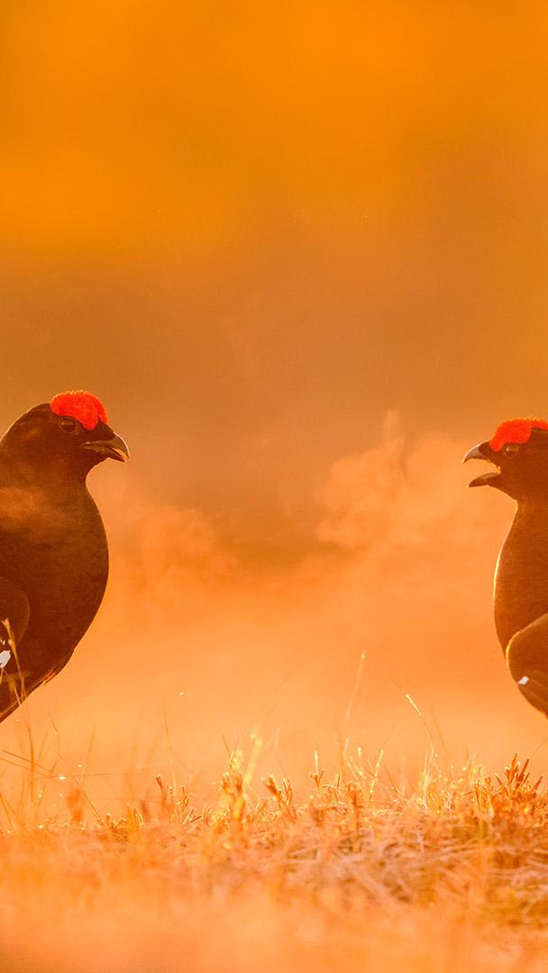 求偶展示场的故事 求偶展示场上对峙的雄性黑琴鸡,爱沙尼亚 (© Sven Zacek/Nature Picture Library)