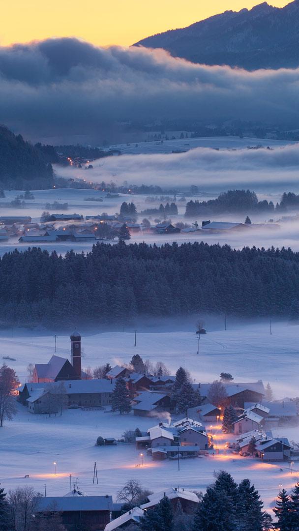 Wenn der Winter Einzug hält, verwandelt sich diese bayerische Landschaft in ein Märchen aus Schnee und Eis. Wälder sind in ein weißes Kleid gehüllt, und die Berge glitzern im Sonnenlicht wie Diamanten. Die Kälte beißt sanft in die Wangen, während der Atem in kleinen Wolken vor einem schwebt. Schnee knirscht unter den Füßen, und die Welt scheint still zu stehen, eingehüllt in eine Decke aus Stille und Frieden.