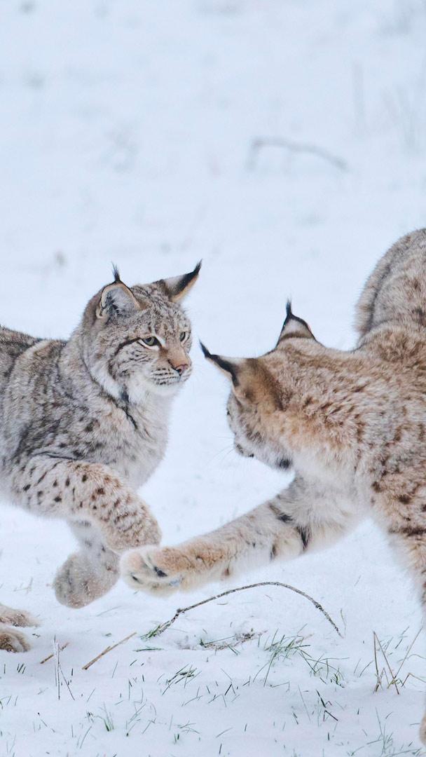 Zwei junge Eurasische Luchse tollen durch den frischen Schnee – ein Anblick, der selbst in den stillen Wäldern Bayerns selten geworden ist und den das heutige Bild eindrucksvoll festhält. Mit ihrem dichten, gefleckten Winterfell sind die beiden perfekt an die kalte Jahreszeit angepasst. Auffällig sind die schwarzen Pinsel an den Ohren, die vor allem der Kommunikation dienen und den Tieren ihren charakteristischen Ausdruck verleihen. Luchse gehören zu den größten Wildkatzen Europas. Ausgewachsene Tiere erreichen eine Schulterhöhe von 55 bis 70 Zentimetern und wiegen je nach Geschlecht meist 18 bis 30 Kilogramm.