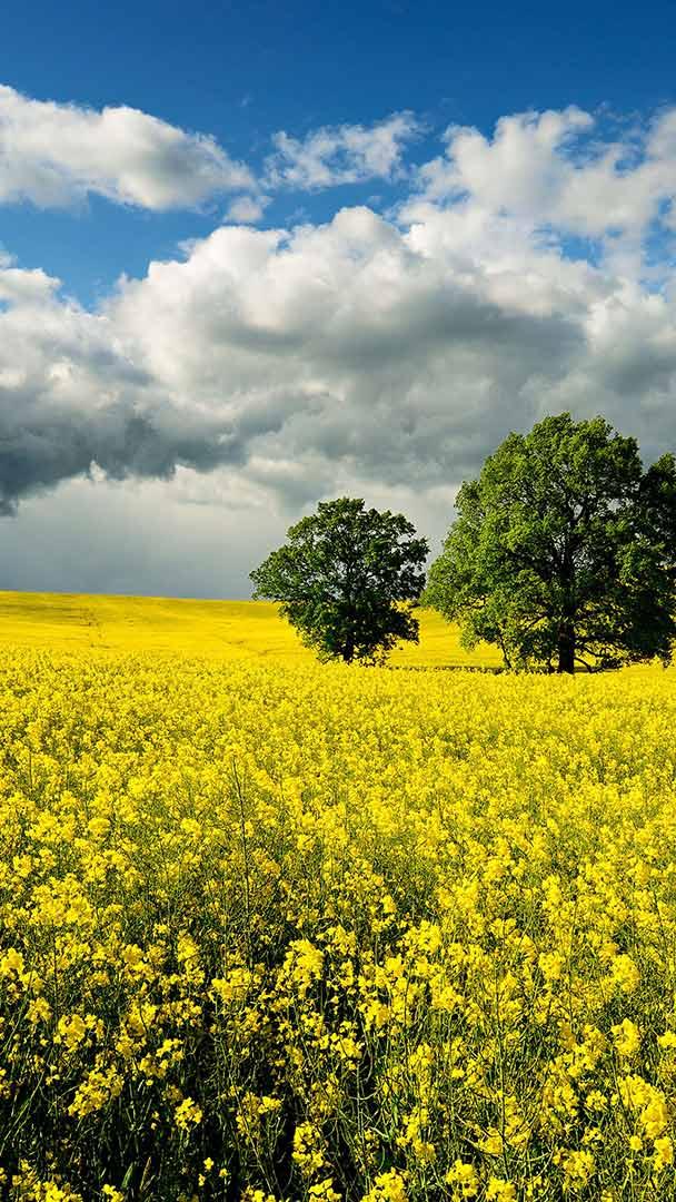 Bald ist Erntezeit Eichen in einem Rapsfeld bei aufziehendem Gewitter, Sachsen-Anhalt (© mauritius images GmbH/Alamy Stock Photo)