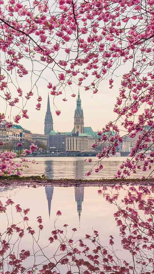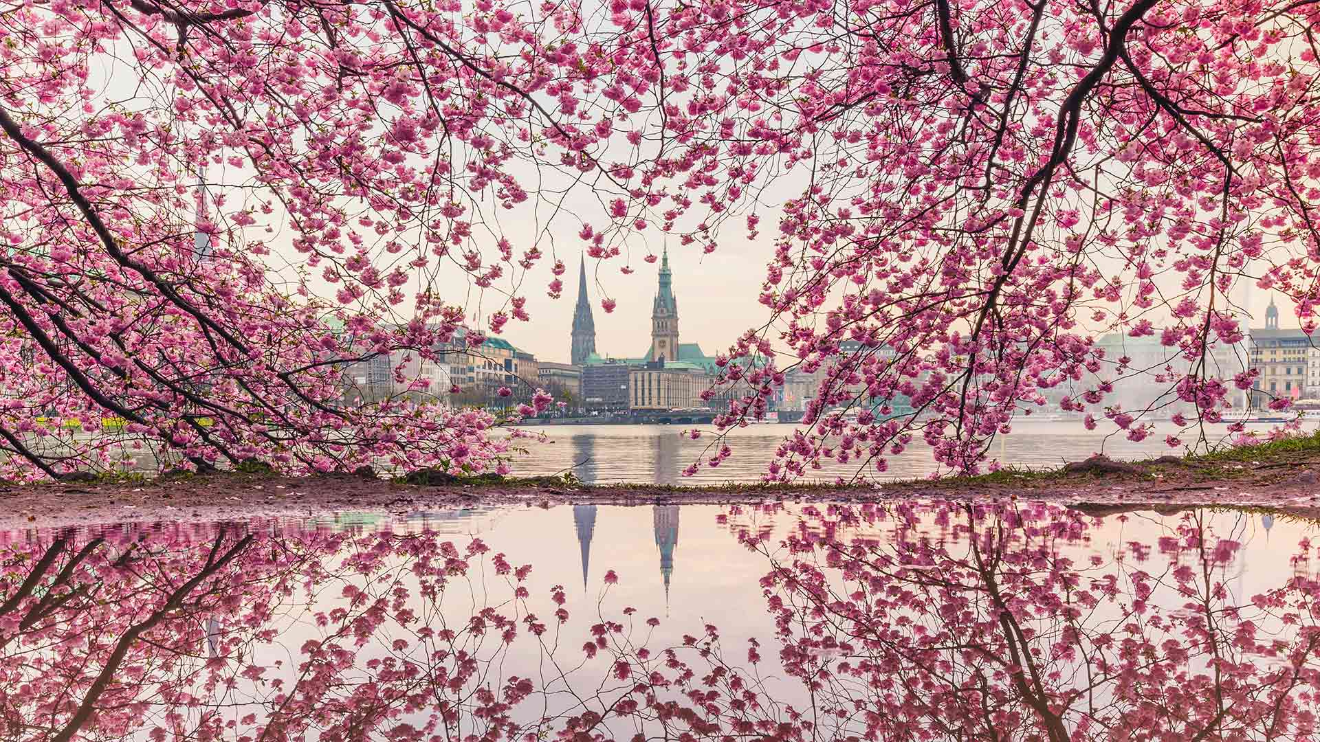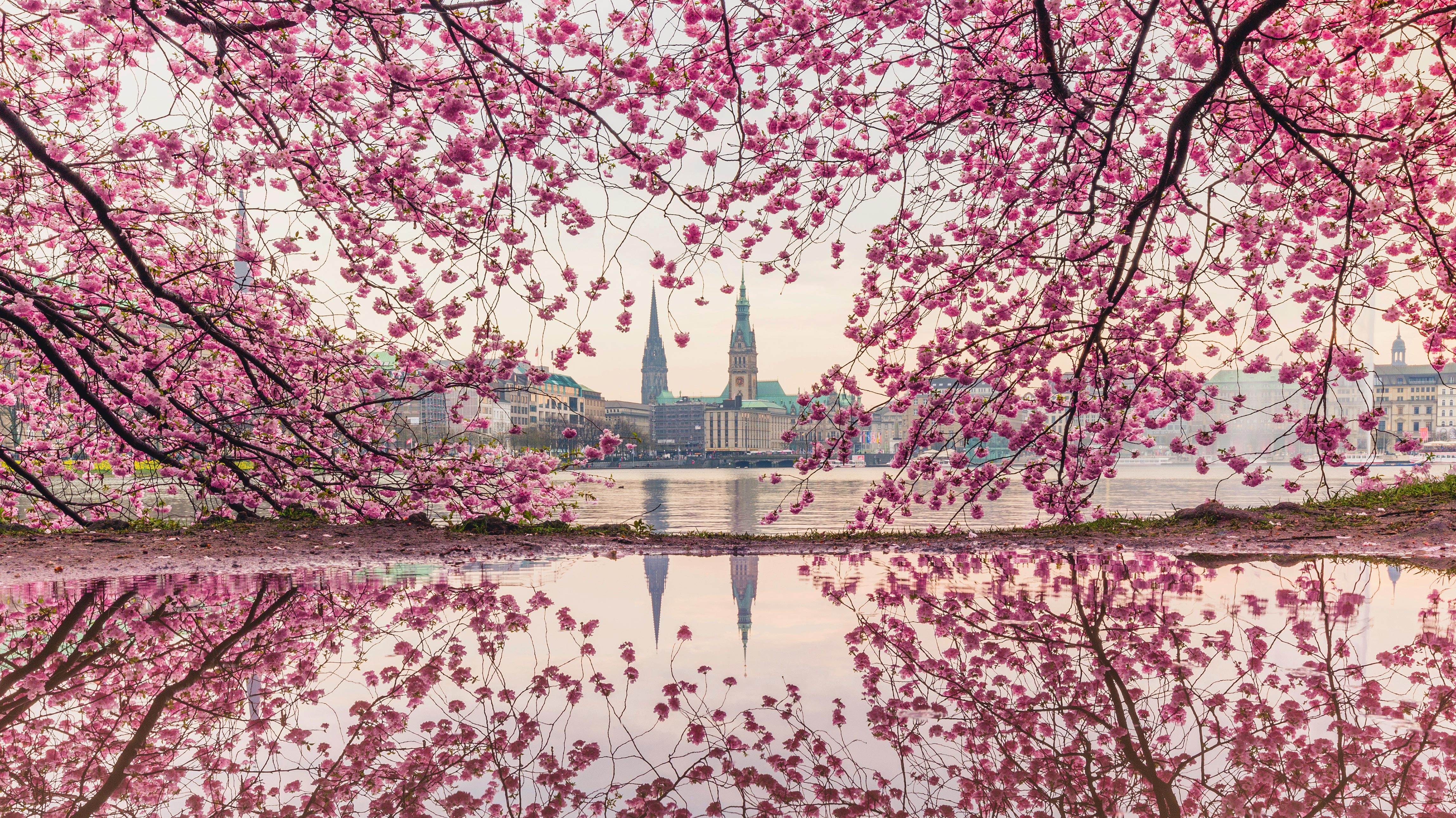 Frühling an der Binnenalster Blühende Kirschbäume an der Binnenalster, Hamburg (© Kerstin Bittner/Westend61/Offset)