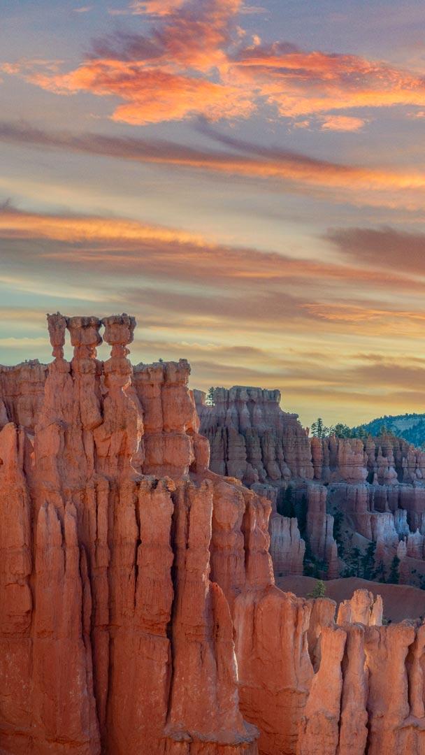 Un bosque de piedras, también conocido como el Parque Nacional del Cañón Bryce en Utah, EE. UU., debe su nombre al pionero mormón Ebenezer Bryce. El parque alberga el Sunset Point, protagonista de la imagen de hoy y un lugar perfecto para contemplar los ‘hoodoos’ o chimeneas de hadas. Estas formaciones rocosas se crean mediante la meteorización por heladas y la erosión fluvial, esculpiendo la piedra en un paisaje surrealista. A una altitud de entre 2.000 y 3.000 metros, este mirador ofrece vistas panorámicas de agujas rocosas en tonos rojo, naranja y blanco. Entre ellas destaca el icónico Martillo de Thor, que domina la zona conocida como la "Ciudad Silenciosa".