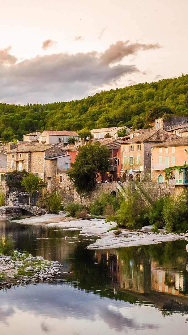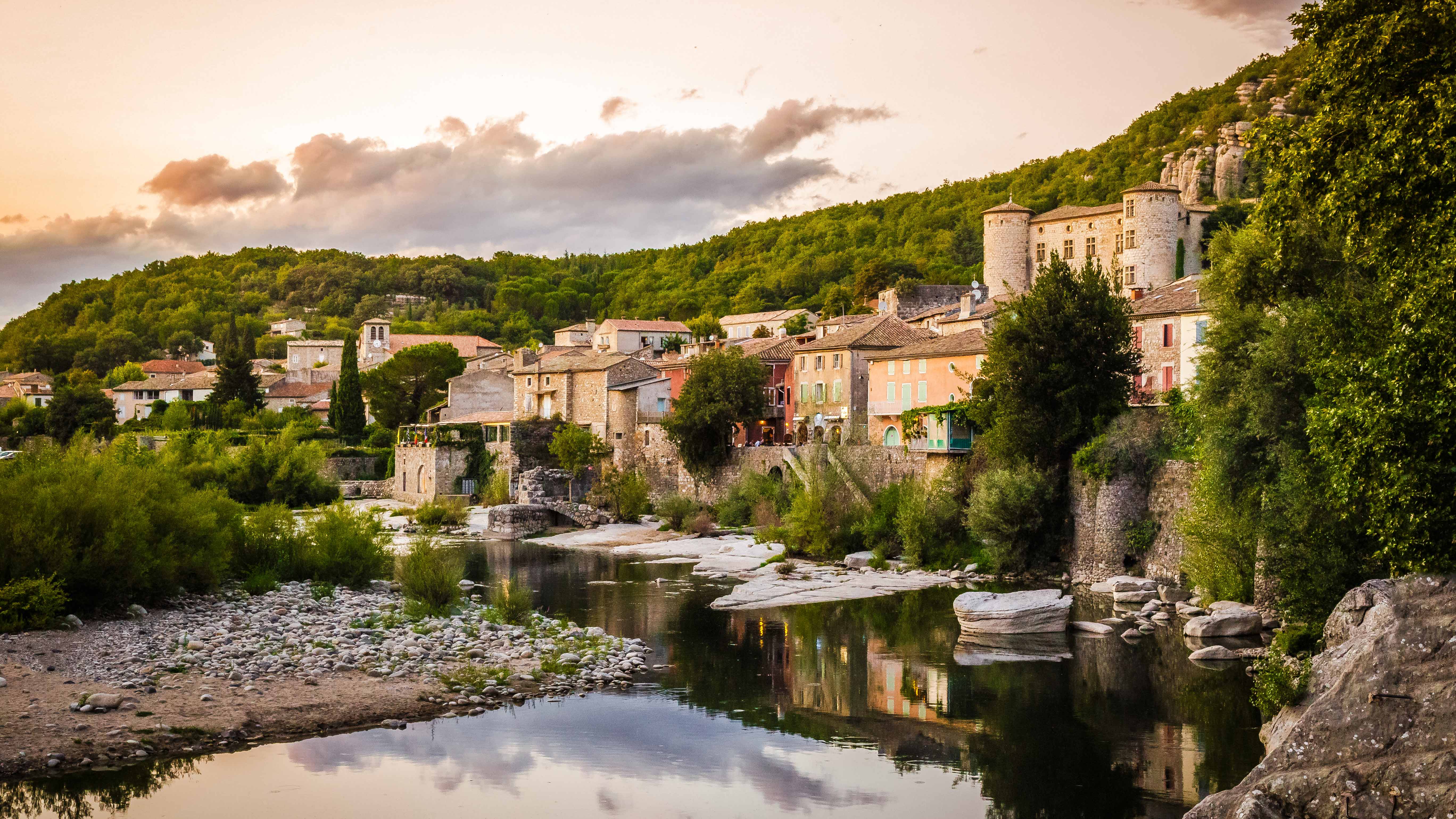 Château sur l’Ardèche L’Ardèche et le village de Vogüé au coucher du soleil (© JeanLucIchard/Shutterstock)
