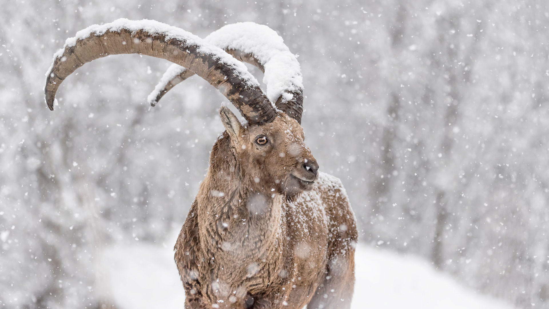 Che grandi corna congelate! Stambecco sotto una forte nevicata, Alpi, Italia (© Paolino Massimiliano Manuel/Getty Images)