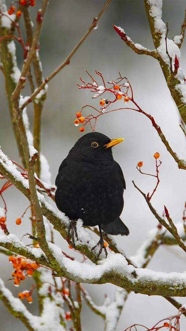 今日は「クロウタドリの日」 雪の枝に留まるクロウタドリ, イギリス エセックス (© Bill Coster/Alamy)
