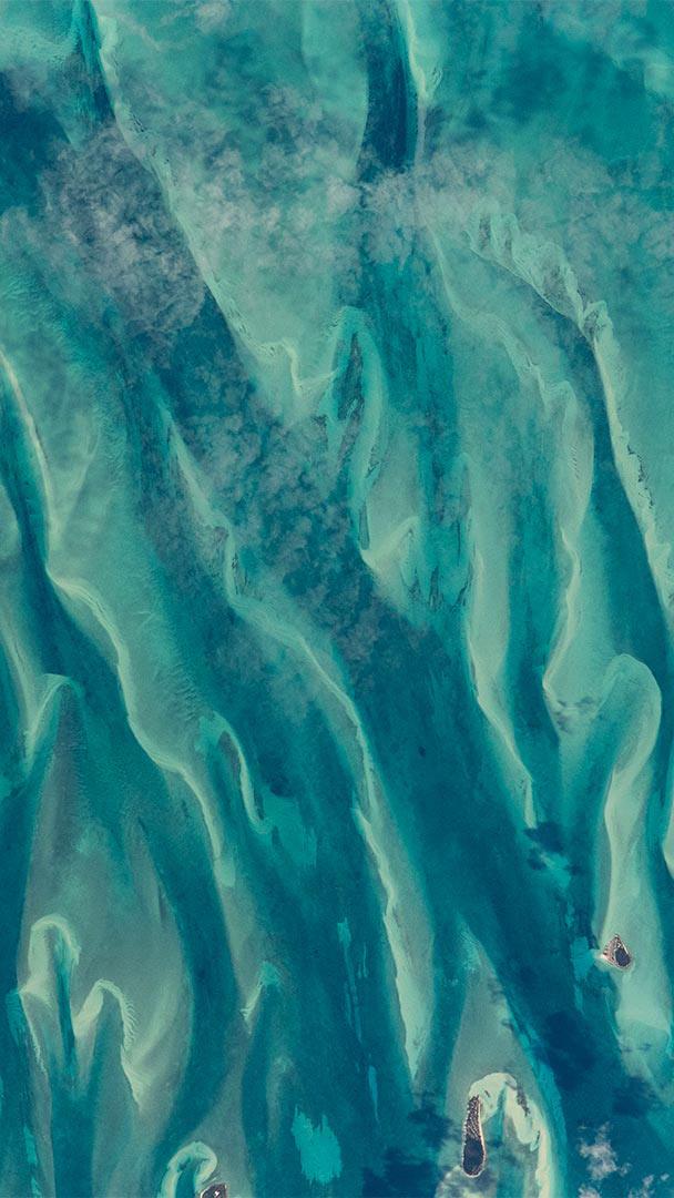 水面下に広がる深海の丘 国際宇宙ステーションから見たバハマ (© NASA)