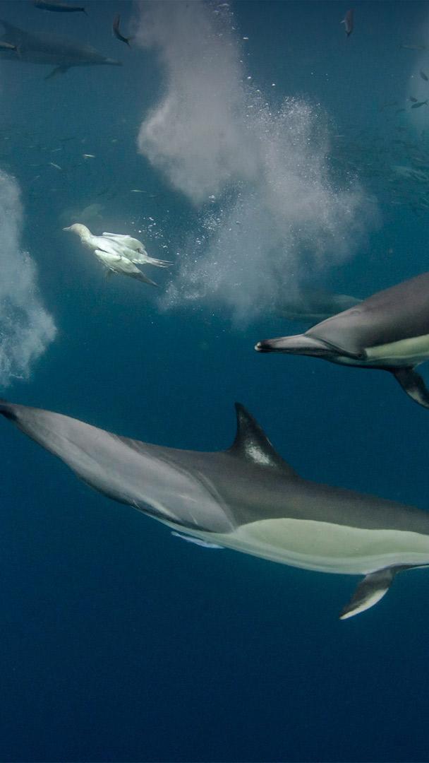 今日は世界海洋デー マイルカとケープシロカツオドリ, 南アフリカ (© Pete Oxford/Minden Pictures)