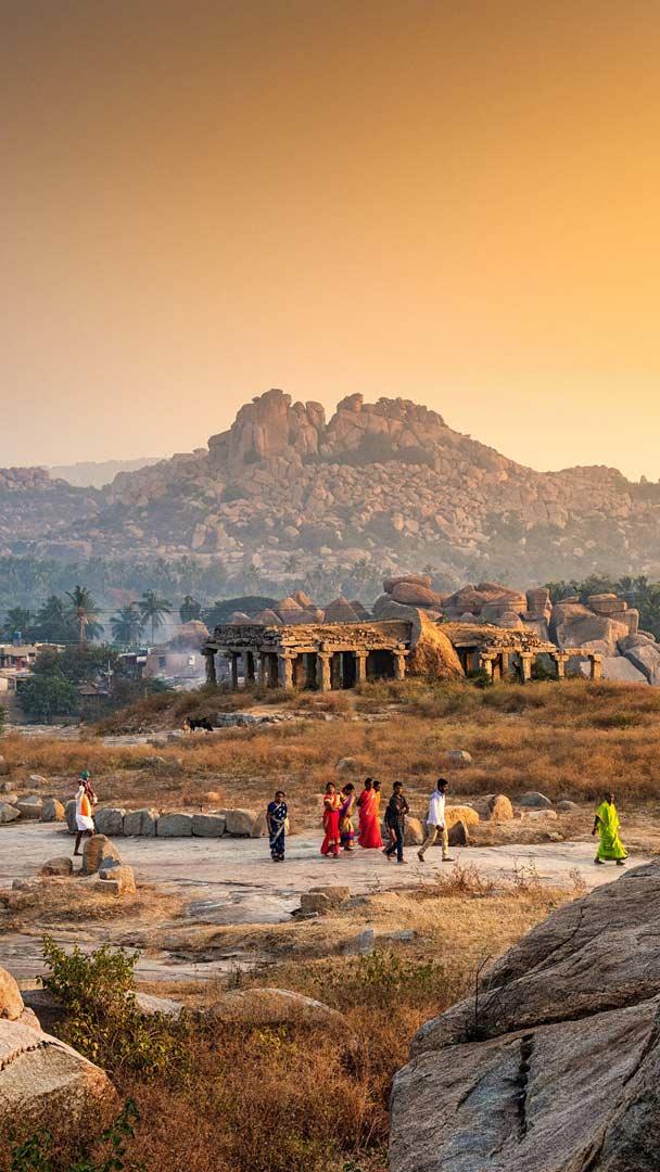 ここはハンピ、インド南部のカルナータカ州にある村で、14 世紀から 17 世紀中頃に存在したヴィジャヤナガル王国の王都として栄えていました。そしてクリシュナ・デーヴァ・ラーヤの治世で最盛期を迎えましたが、1565 年にイスラーム勢力との戦いに敗れて衰退し、1649 年に滅亡しました…
