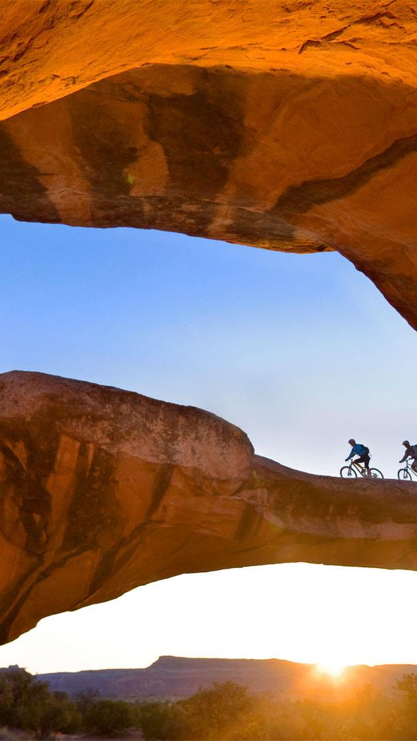 Don’t look down! Cycling across a natural rock arch in the desert near Moab, Utah, USA (© Whit Richardson/Cavan)