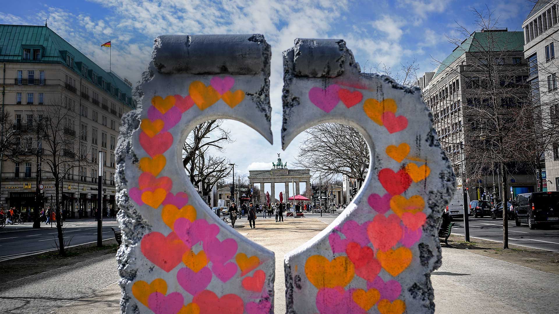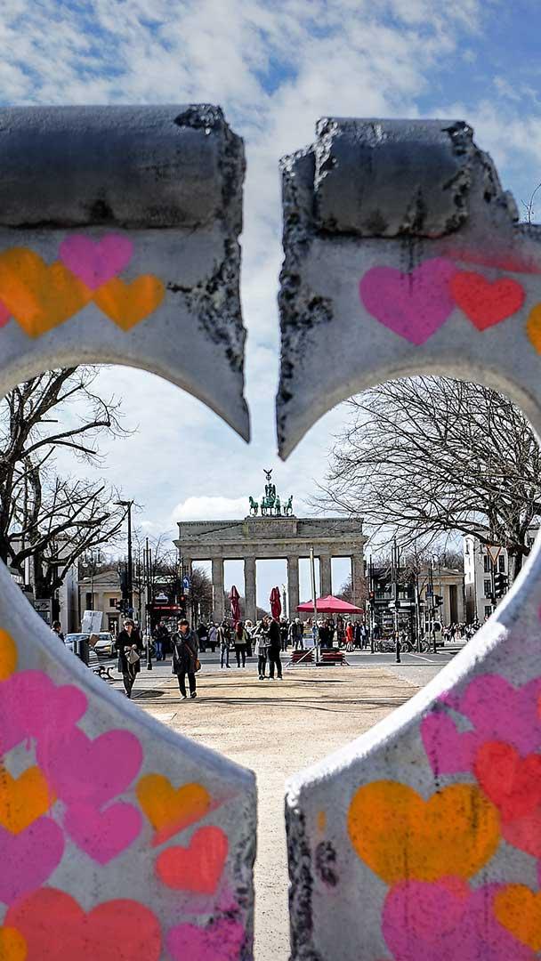 We"re gazing at the Brandenburg Gate—a symbol of peace and unity—through a heart-shaped replica of a remnant of the Berlin Wall, probably the most potent symbol of the political division that once scarred the German capital. Today marks the 30th anniversary of the fall of the concrete barrier that once obstructed this view.