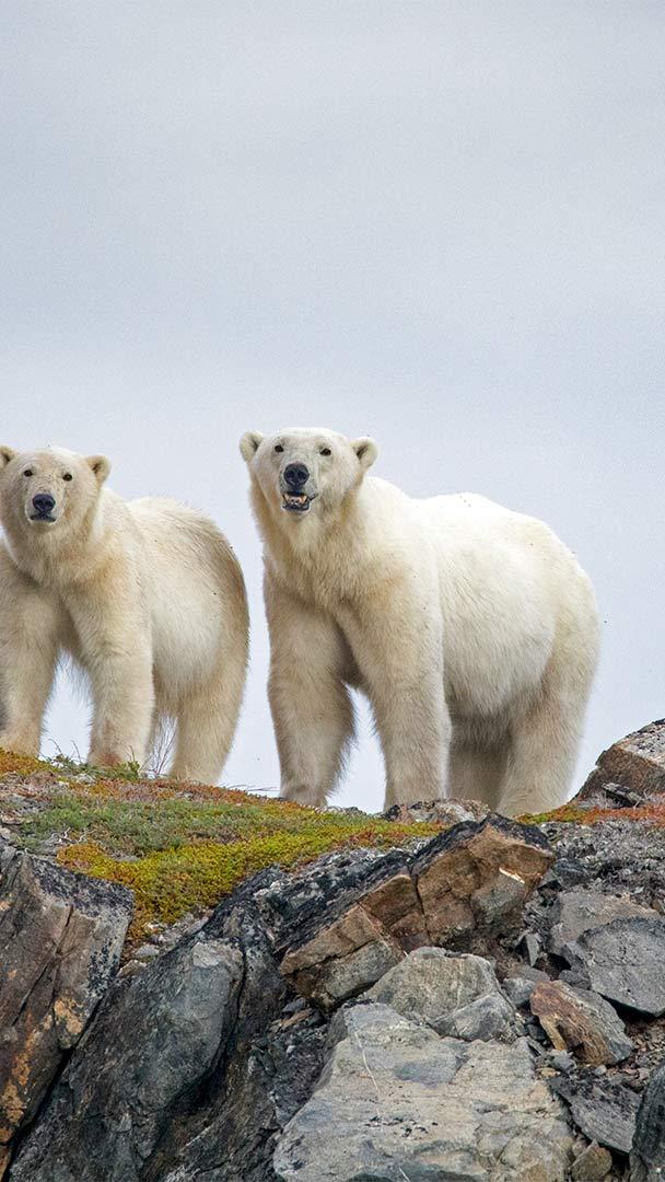 These polar bears seem to be just as happy as we are to visit Torngat Mountains National Park today. Located in Canada at the tip of the Labrador Peninsula and bordering the Labrador Sea, the park is accessible only by boat, charter plane, or helicopter. The name "Torngat" comes from the Inuktitut word "Tongait," meaning "place of spirits." The Inuit have lived here for centuries and still fish and hunt across the wide tundra valleys where these polar bears roam. This time of year, polar bears are waiting for the sea ice to form so they can venture out onto the Labrador Sea to hunt for seals.
