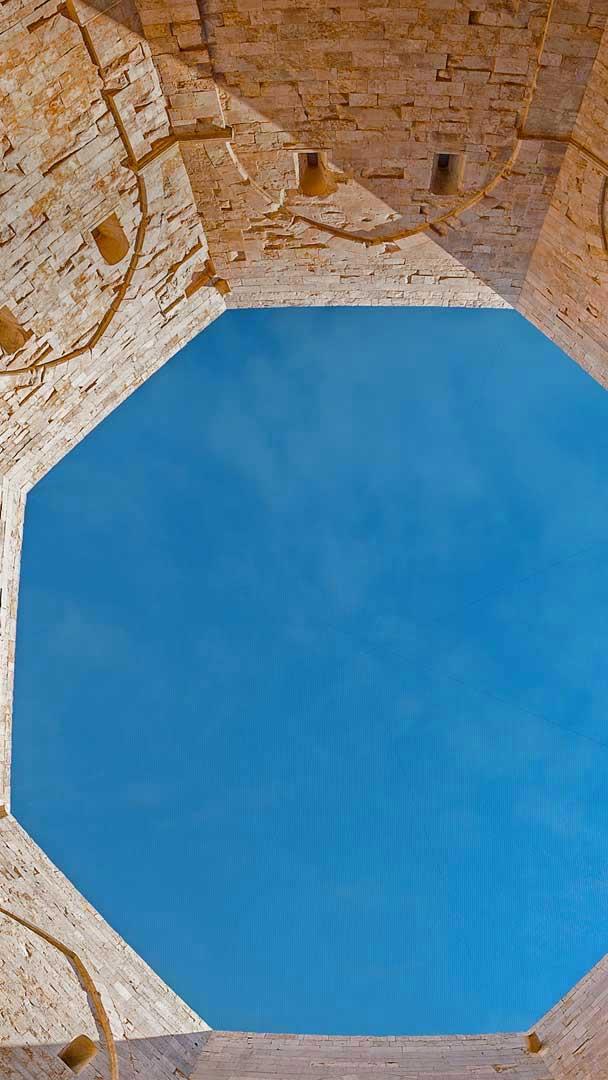 Built in the 1240s by the Holy Roman Emperor Frederick II in southeast Italy, Castel del Monte (Castle of the Mount) features an unusual octagonal design. Eight stone walls stretch between eight octagonal towers and enclose an octagonal courtyard. Each of the two floors also has eight trapezoidal rooms. Acclaimed and protected as a World Heritage Site in 1996, the castle symbolically reflects a harmonious integration of classical Roman, Arabic, and medieval architecture and design—and to some, its octagonal symmetry suggests a connection between heaven and earth.