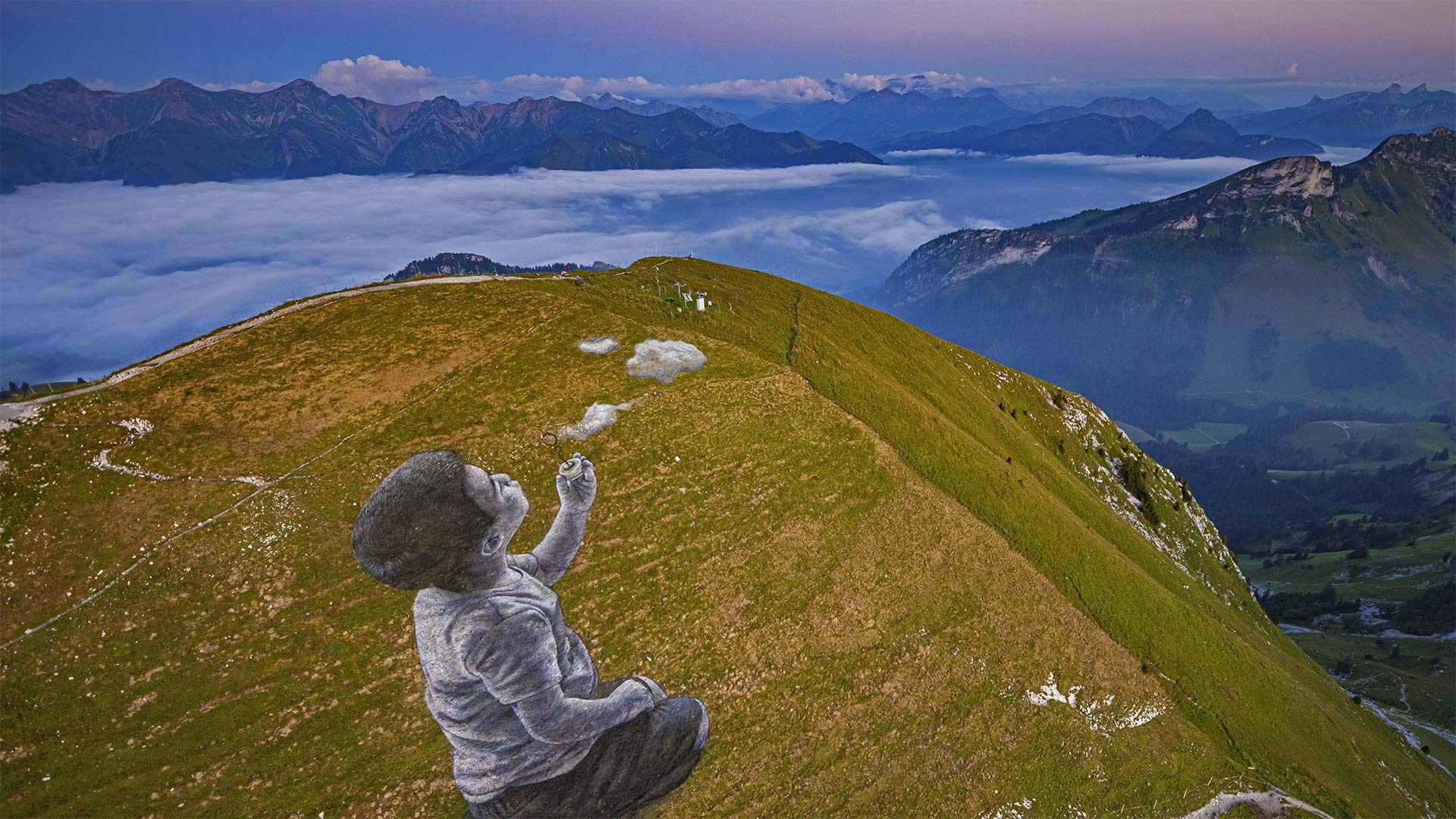 For World Children"s Day, we"re featuring an aerial view of a larger-than-life painting on the summit of the Moléson in the Swiss Prealps. The 16,000-square-foot fresco is titled "Un Nouveau Souffle" (A New Breath) and depicts a child blowing clouds toward the horizon. It was created by French-Swiss artist Saype—real name Guillaume Legros—who is known for his grassy graffiti around the world. The eco-friendly artist uses biodegradable paints made from natural pigments such as coal and chalk, so by the time you read this, his land art will have already disappeared into the soil.