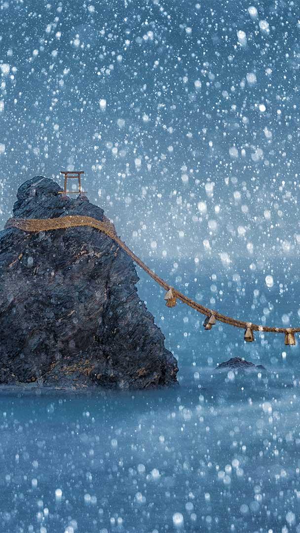 Just off the shore of Futami, in the southern-central region of Japan"s main island, Honshu, two rocks represent a sacred union between a divine couple. Known collectively as Meoto Iwa (Wedded Rocks), these sea stacks represent Izanagi and Izanami, the married brother-and-sister deities who created the islands of Japan and its gods in Japanese mythology. The large rock on the left is said to be the husband, Izanagi, and at its peak is a small torii, a symbolic gateway marking the entrance to a Shinto shrine. The smaller rock represents his wife, Izanami.