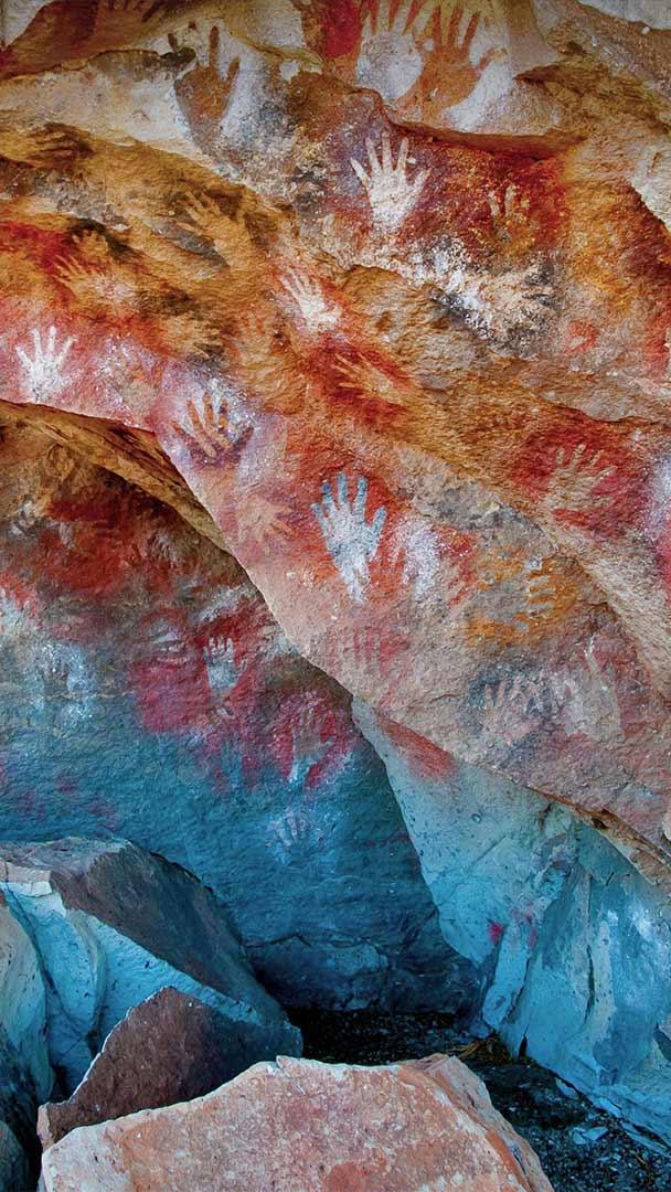 What at first glance appears to be graffiti tagged on a rock wall is, in fact, artwork created by the first human settlers of this remote region deep in Argentine Patagonia. It"s thought that the cave paintings were made between 13,000 and 9,500 years ago. The archaeological site is known in Spanish as the Cueva de las Manos (Cave of the Hands). It"s the largest display of prehistoric handprints in the world, made all those years ago by people holding a hand against the rock wall and blowing pigments through tubes made of bone. Of the 829 black, white, red, and ochre prints, most are of young male hands. One print has six fingers, and only 31 are of right hands.