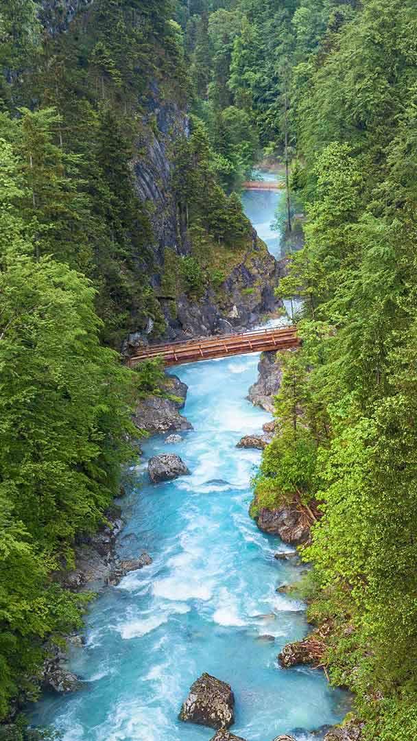 These whitewater rapids are found in Upper Austria, where the Steyr River crashes down from the barren Totes Gebirge (the Dead Mountains) through this verdant landscape. When it comes to the ancient town of Steyr, at the foot of the Alps, it will meet the Enns River, which flows into the Danube.