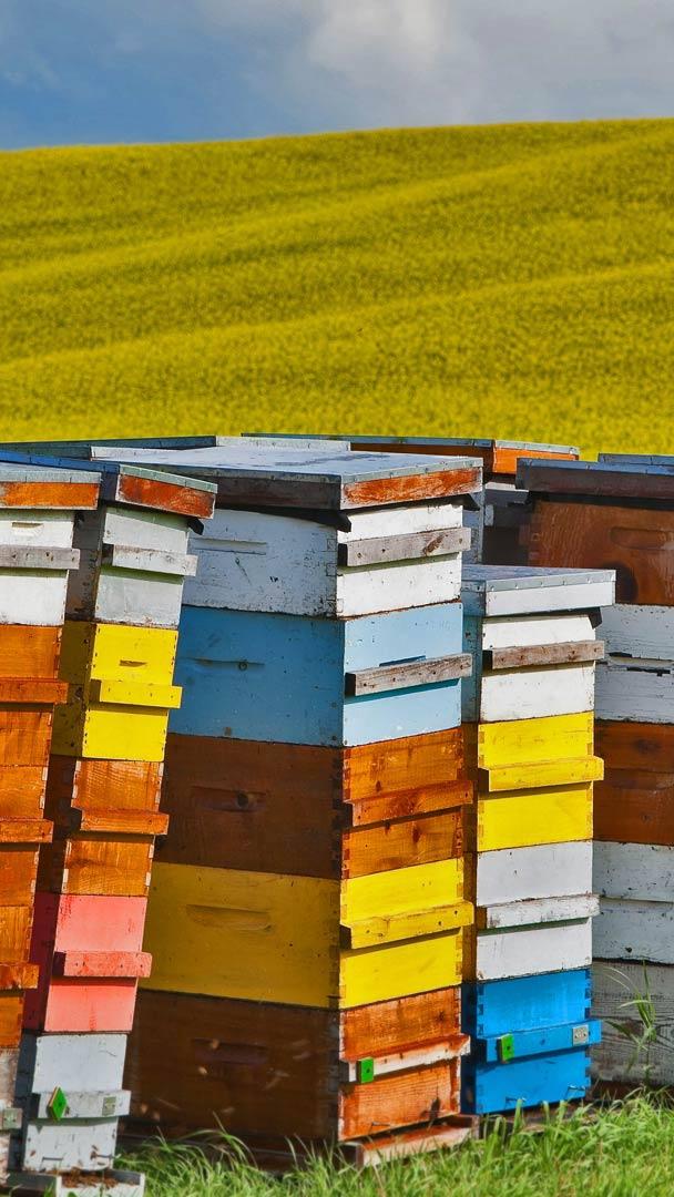 Why are dozens of colorful boxes stacked in this field? To provide homes inside their walls for millions of honey bees, those hardworking pollinators, producers of honey, and tormenters of Winnie-the-Pooh. Wild honey bee colonies build their nests in trees and caves, but manmade boxes also do the trick, and humans have been building their own beehives since antiquity. The modern beehive boxes shown here contain frames to hold honeycombs that bees produce to store their honey, pollen, and young. When the bees have produced plenty of honey, the beekeeper can simply remove the frames to extract some of it, leaving the rest to nourish the hive.