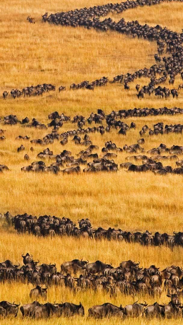 The blue wildebeest embark on their spectacular annual migration to follow seasonal rains and the growth of plentiful grasses. The timing can vary from year to year, depending on the weather. But generally by this point in the year, the giant herds are moving from the northern Serengeti in Tanzania across the border into Kenya’s Maasai Mara National Reserve, shown in this photo. The annual migration sees over 1 million of these grass-eating bovines crossing miles of African savanna, often following the plains zebra as they make similar trek. By December they’ll be back in Tanzania for the rainy season. Many of the nations where the wildebeest migrate recognize that keeping the migration safe and healthy draws in tourist money. Many parks and preserves are established along the migration route, ensuring the safety of the animals, and allowing humans to view this marvel in person.