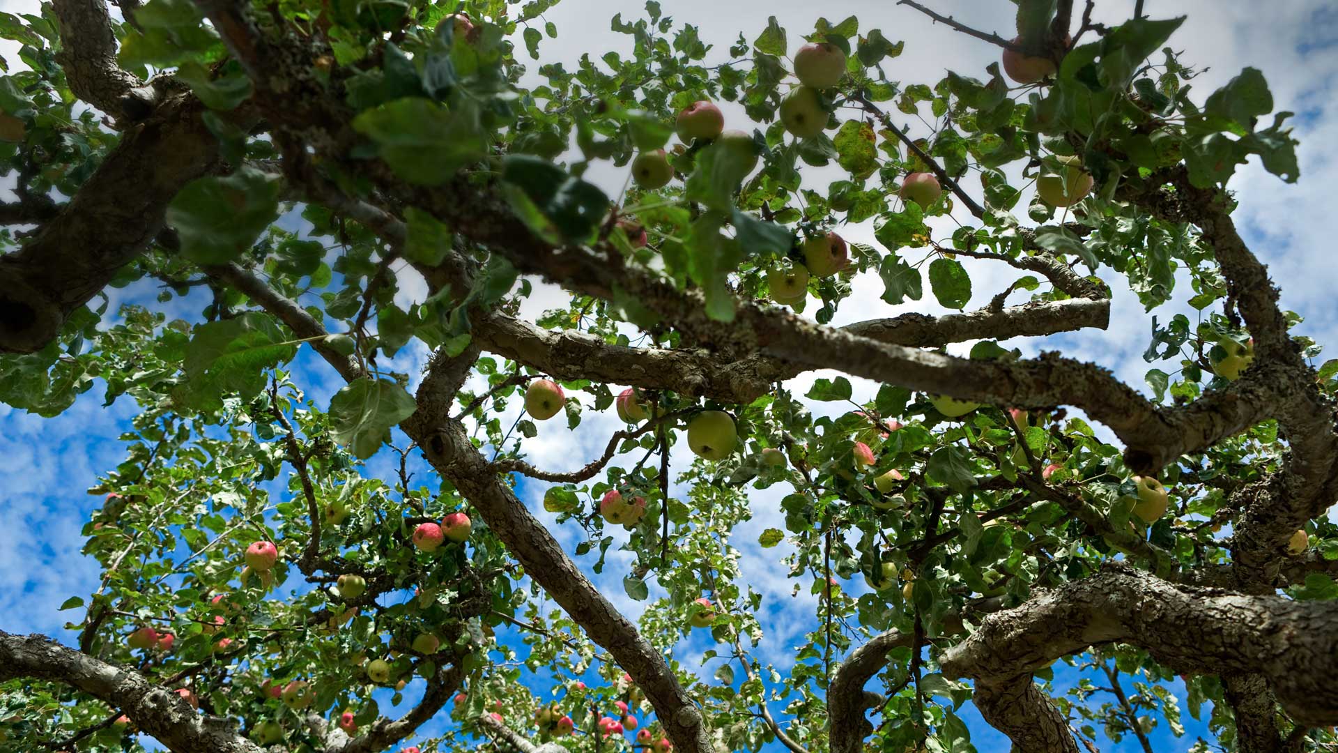 Apples can be traced back to the mountains of Central Asia. In late 4th century BCE, Alexander the Great was busy conquering that region, and while in what is modern-day Kazakhstan he came across wild apples. Alexander’s military machine brought some of the plants back to Europe, and over the centuries, cuttings and seed splices began to produce the fruit as we know it now. The apples ready for harvest in this photo are on Salt Spring Island in British Columbia, Canada—a long way from Central Asia.