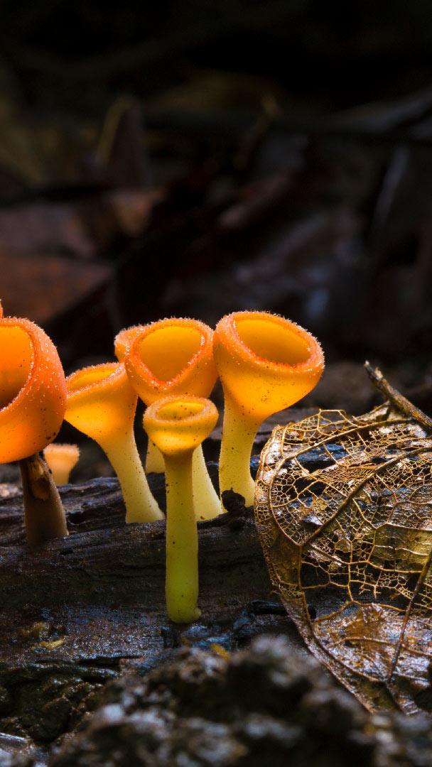 It’s peak season for many kinds of mushroom, but to find this unique species you’ll have to travel someplace tropical. This cup fungus, cookeina, was photographed growing on the rainforest floor in Costa Rica. Like other fungi, it serves as a decomposer, helping to break down dead plants and animals in the ecosystem. Their unique cup shape aids in spore dispersal; it helps raindrops to splash spores out into the forest where the fungi can spread.